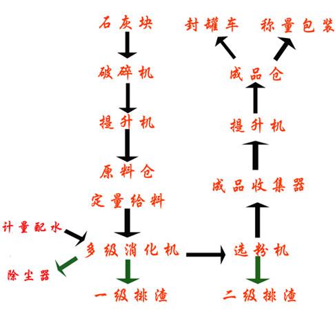 原料生石灰由裝載機(jī)加料倉中,并由振動給料機(jī)均勻給料到破碎機(jī)破碎10mm以下。破碎后的生石灰經(jīng)輸送設(shè)備送入多級消化器。加水?dāng)嚢杞?jīng)多級消化反應(yīng)生成氫氧化鈣。消化過程中產(chǎn)生水蒸氣及揚(yáng)塵經(jīng)除塵器過濾后排空。消化后氫氧化鈣經(jīng)輸送設(shè)備送入氫氧化鈣分級機(jī)(選粉機(jī))分級。合格細(xì)粉經(jīng)輸送設(shè)備送入成品料倉。不合格粗粉排查或根據(jù)工藝要求經(jīng)輸送設(shè)備送入磨機(jī)(雷蒙磨)研磨。磨后經(jīng)螺旋收粉器收集細(xì)粉。經(jīng)輸送設(shè)備送入氫氧化鈣分級機(jī)(選粉機(jī))分級。合格細(xì)粉經(jīng)輸送設(shè)備送入成品料倉。雷蒙磨富余含塵氣體布袋除塵器過濾排空。收集細(xì)粉經(jīng)輸送設(shè)備送入氫氧化鈣分級機(jī)(選粉機(jī))分級。合格細(xì)粉經(jīng)輸送設(shè)備送入成品料倉。